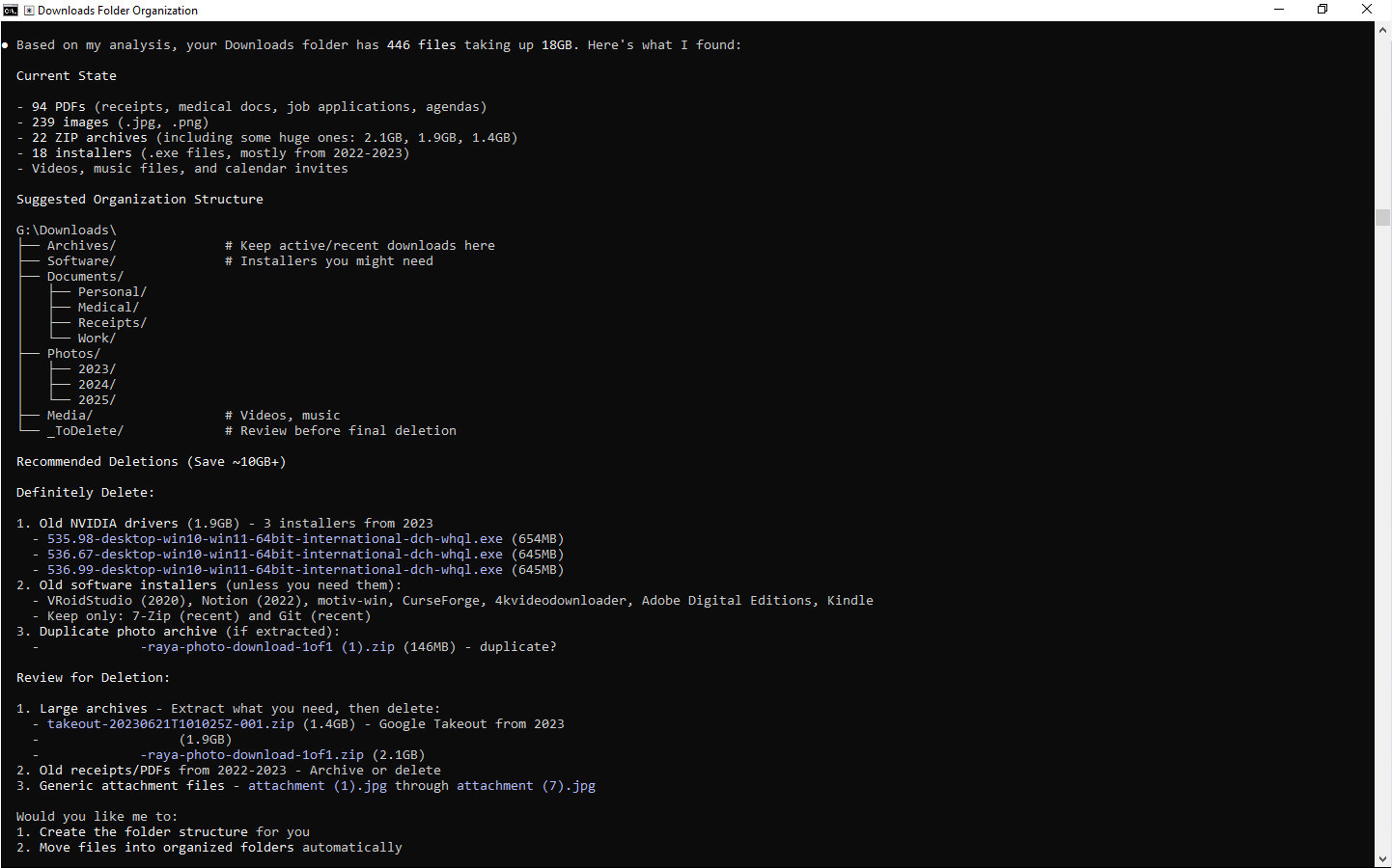 I could’ve updated my settings so that I’m prompted to decide where to save a file before downloading – but instead, I just have everything download to a single folder to reduce the cognitive load every time I want to download a file. And organizing files isn’t just dragging them into folders. You have to make hundreds of small decisions: Should I keep this 2-year-old NVIDIA driver? Are these “attachment” files important or just clutter? How should I organize medical PDFs vs receipts vs personal documents? In the past, I’ve literally spent hours thinking through this, but my bandwidth is always stretched thin now, and tasks like that are now relegated to wishful thinking to my future self; but now AI can do this in minutes!
