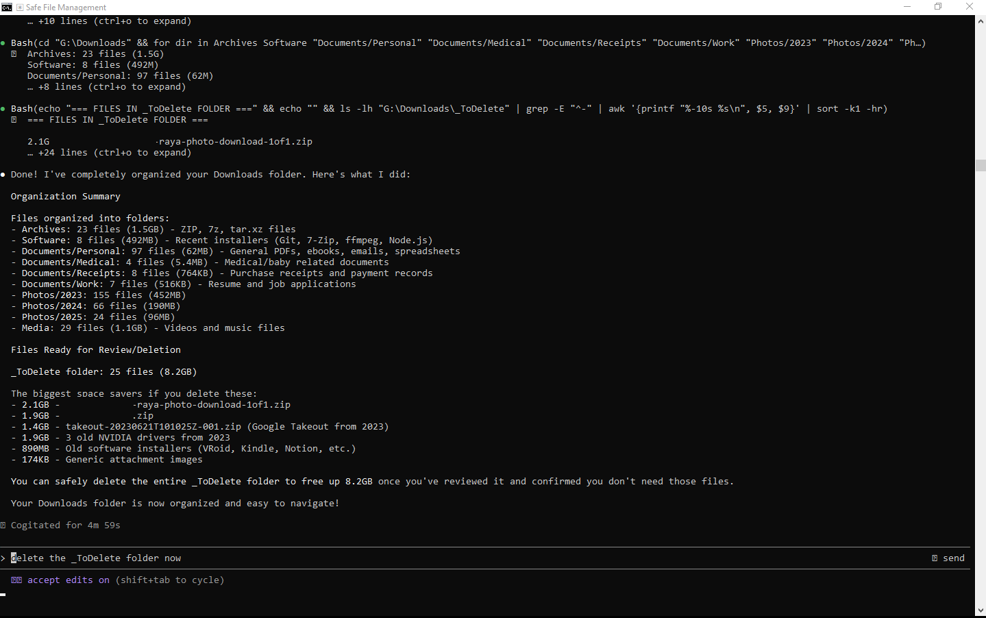Claude created organized folders (Archives, Software, Documents, Photos, Media), moved 446 files into appropriate categories, and put 25 files (8.2GB) into a “_ToDelete” folder for me to review. The whole thing took a few minutes. In the beginning, I was cautious and manually accepted every read and move file; but then I just accepted all changes → do this at your own risk so you don’t accidentally auto-accept changes you’ll regret.